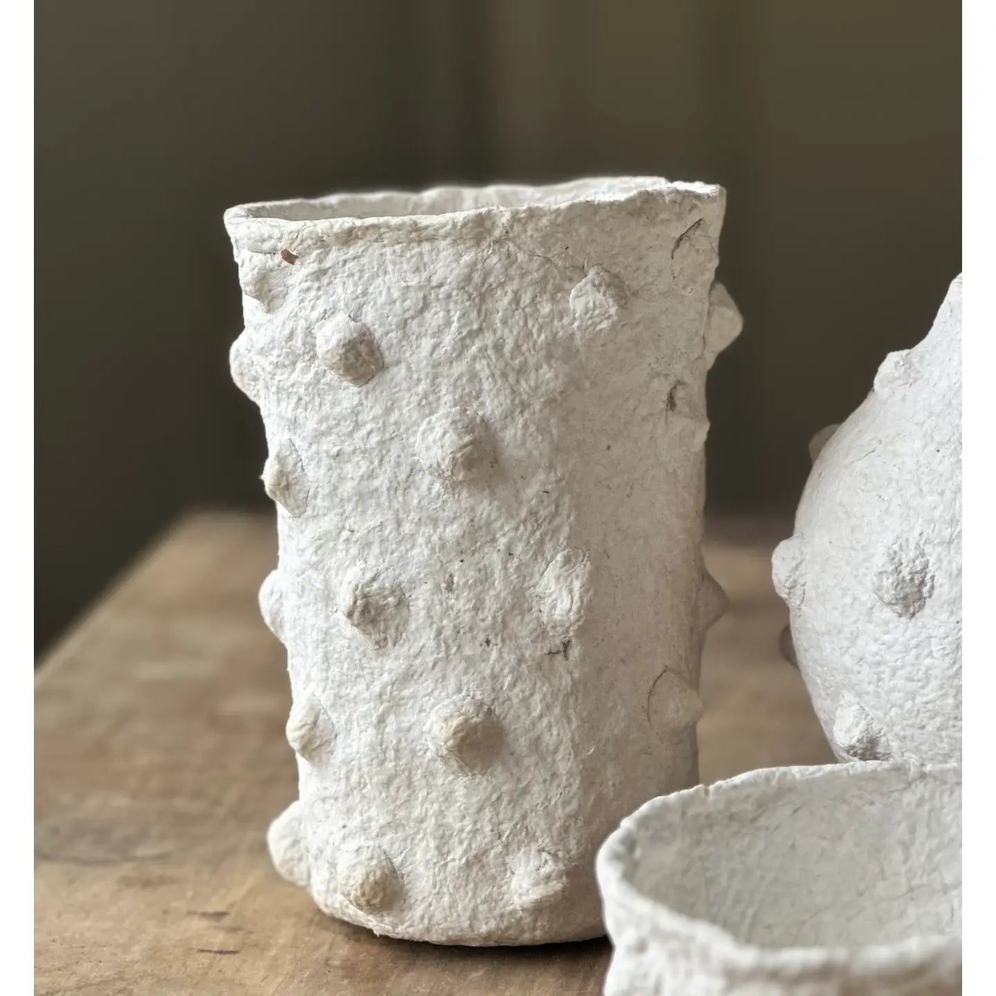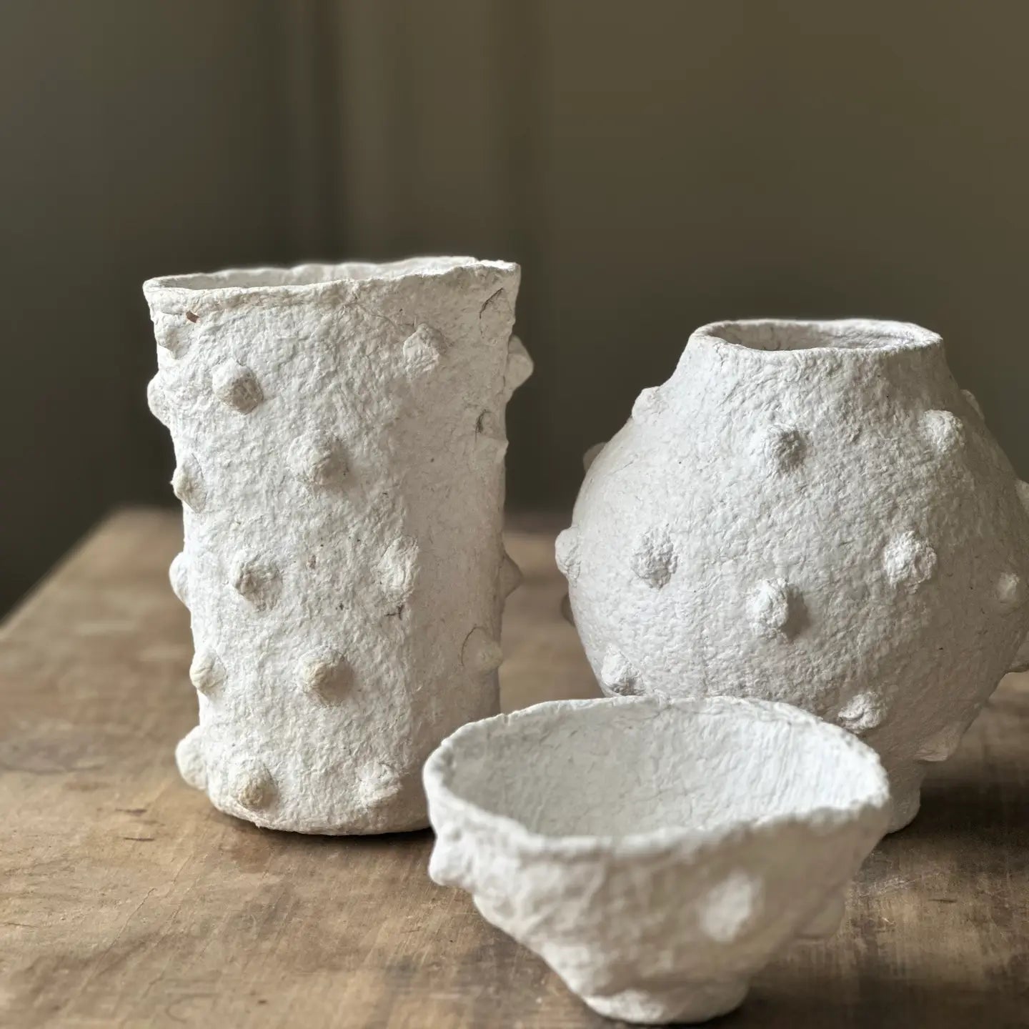 Crafted by hand and rich in artisanal texture, this trio of sculptural vessels brings a quiet, avant-garde elegance to your home. Made from layered papier-mâché with organic bumps and soft curves, each piece is a tactile meditation in form and imperfection.