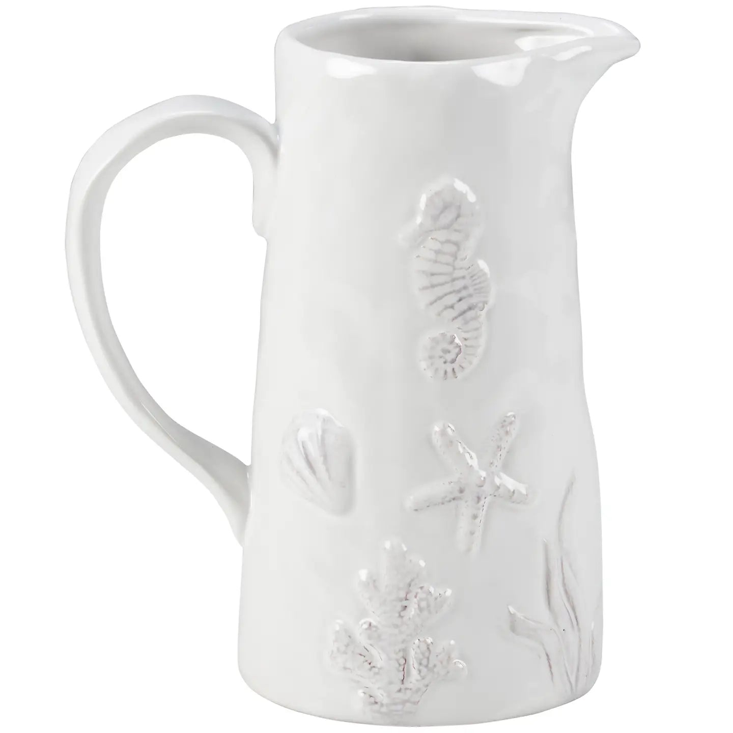 A lightweight, but durable ceramic pitcher from our Beach Collection displaying a clean white glaze finish with embossed designs of various sea life and ocean plants around the outside. Embossed ocean designs feature textured detail. Our Beach pitcher is microwave, dishwasher, and food safe for convenient use. A piece of everyday tableware perfect for oceanic themed gatherings.