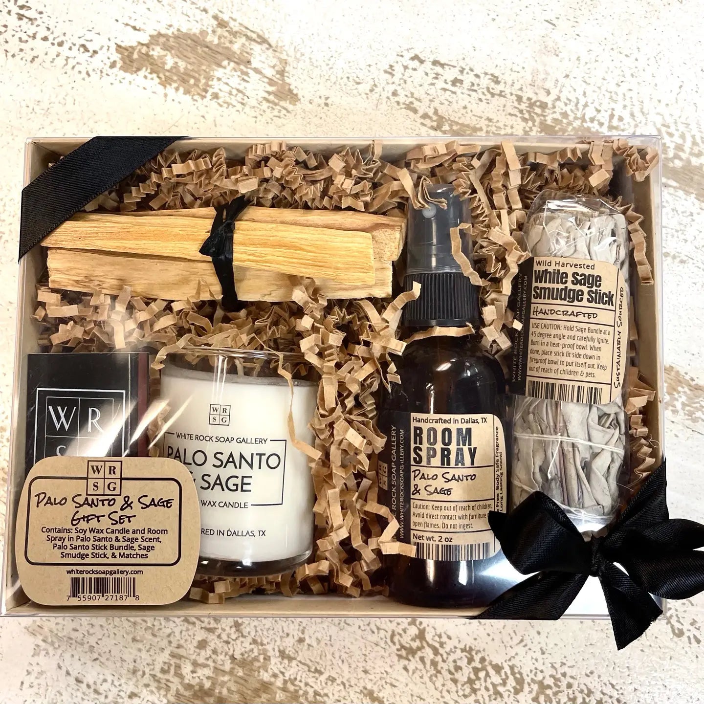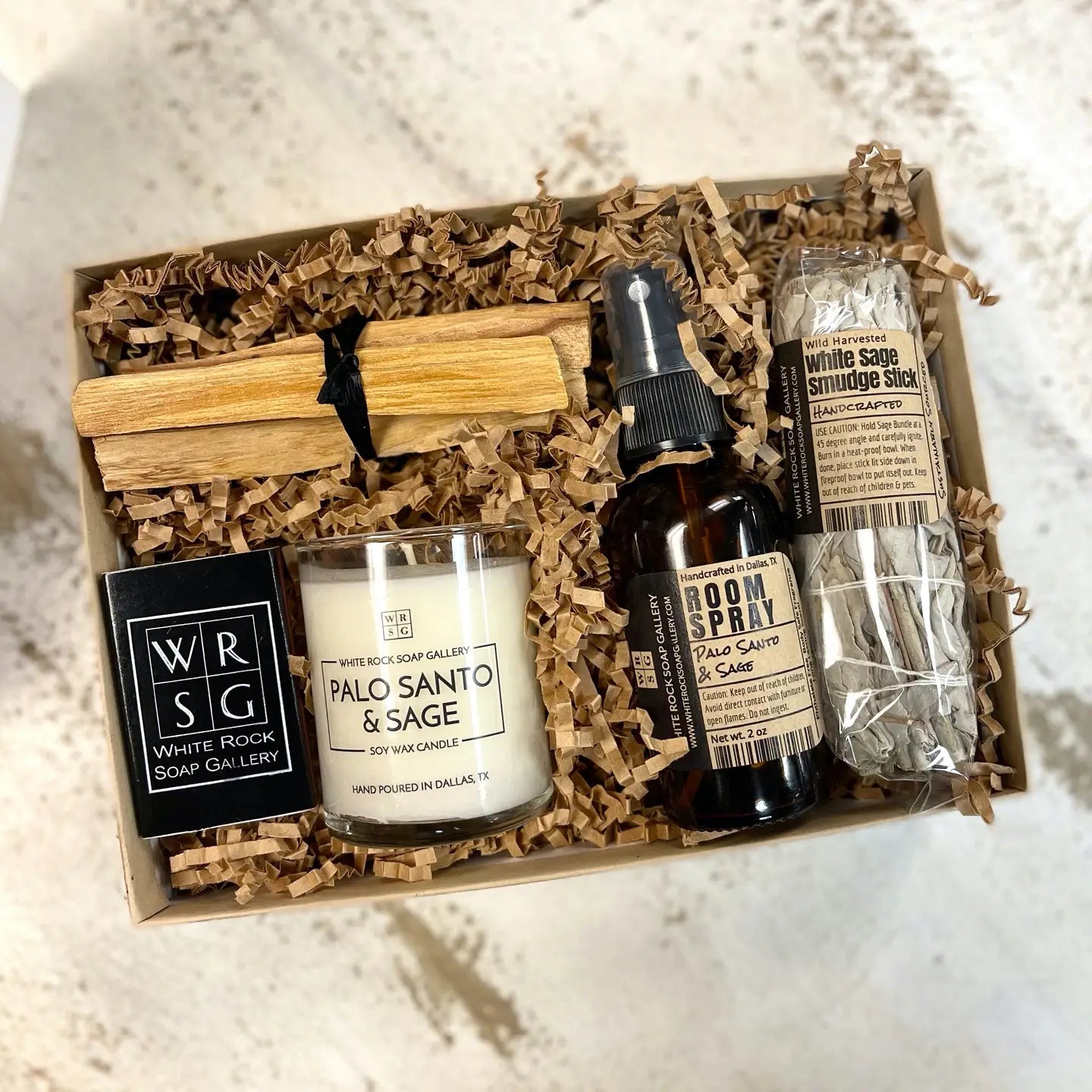 Our 5 Piece Palo Santo & Sage Gift Set includes a Soy Wax Votive Candle, 2 oz Room Freshening Spray, 3 Palo Santo Sticks, 1 White Sage Smudge Stick, and a pack of matches in a Kraft box with a black bow.