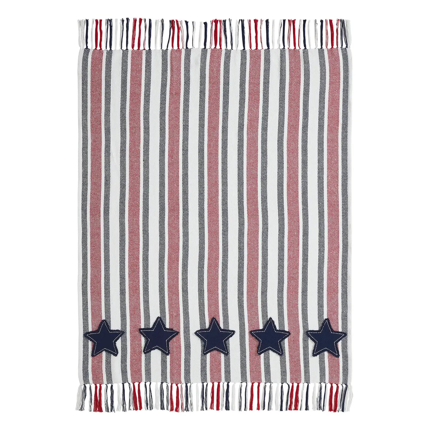 This cozy and stylish throw features a classic Americana design with navy, red, and creme stripes accented by appliqued navy stars along the bottom edge. The stars are trimmed with intricate rice stitching, adding a touch of handcrafted elegance. Knotted tassels on each end and an unfinished edge complete the look, giving this blanket a rustic yet refined appeal.